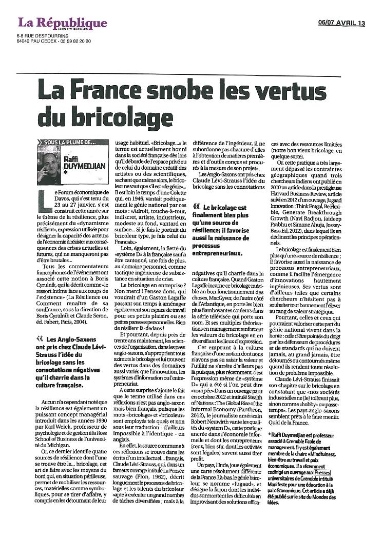 Raffi Duymedjian est professeur associé à Grenoble École de Management. Ses enseignements portent principalement sur le Knowledge management d’une part, et des aspects de méthodologies du raisonnement d’autre part. Ses recherches se déclinent dans deux directions : d’une part une théorie du bricolage observé sous différents angles (innovation incrémentale, bricolage managérial, bricolage dans les industries culturelles) ; d’autre part, une approche plus globale autour de l’idée d’une économie du peu et de l’ingéniosité. Depuis deux ans, il est l’un des principaux instigateurs du groupe de travail intitulé « pour une éducation à la paix économique ».