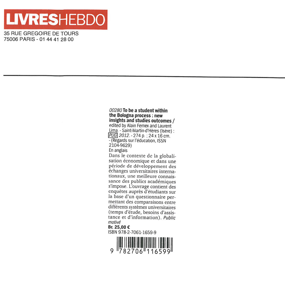 This work is the result of an international scientific collaboration that has been going on for ten years. The research’s themes are higher education and students. A lot of works are now produced on higher educational policies, at a national level, but also at an international level. The originality of this book is that it proceeds by inquiries with the students, on the basis of an international questionnaire that allows international comparisons.