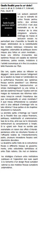 Cet ouvrage, qui propose « une réflexion scientifique sur les enjeux économiques des systèmes fiscaux européens face aux crises financières