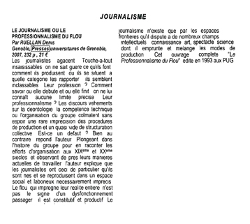 Plongeant dans l'histoire du groupe pour en raconter les efforts d'organisation aux XIXe et XXe siècles, et observant de près leurs manières actuelles de travailler, l'auteur explique que les journalistes ont ceci de particulier qu'ils sont nés et se reproduisent dans un espace social et laborieux nécessairement imprécis. Le flou, qui imprègne leur réalité entière, n'est pas le signe d'un dysfonctionnement passager : il est constitutif, et productif. Le journalisme n'existe que par les espaces frontières qu'il dispute à de nombreux champs intellectuels : connaissance, art, spectacle, science, dont il emprunte et mélange les modes de production.