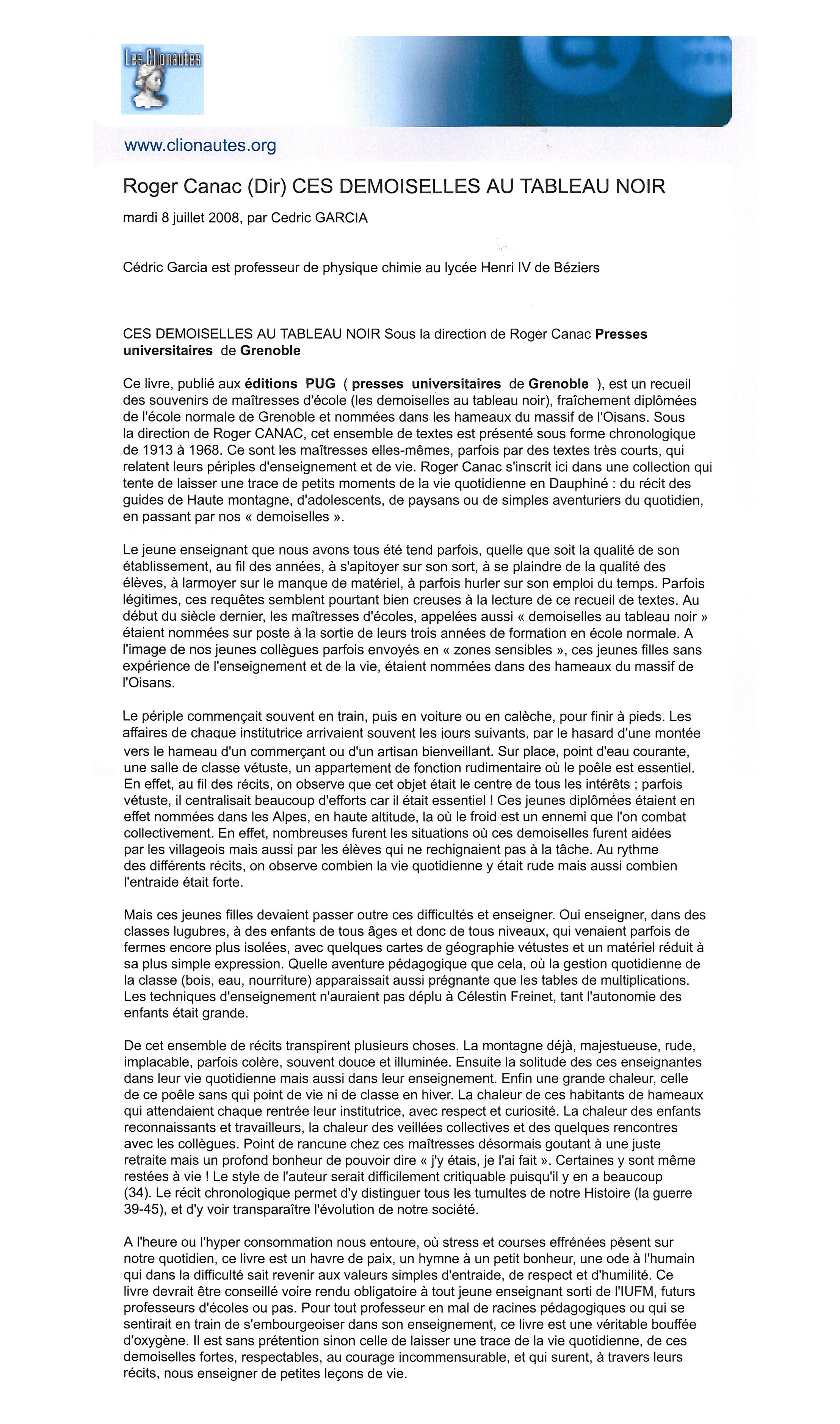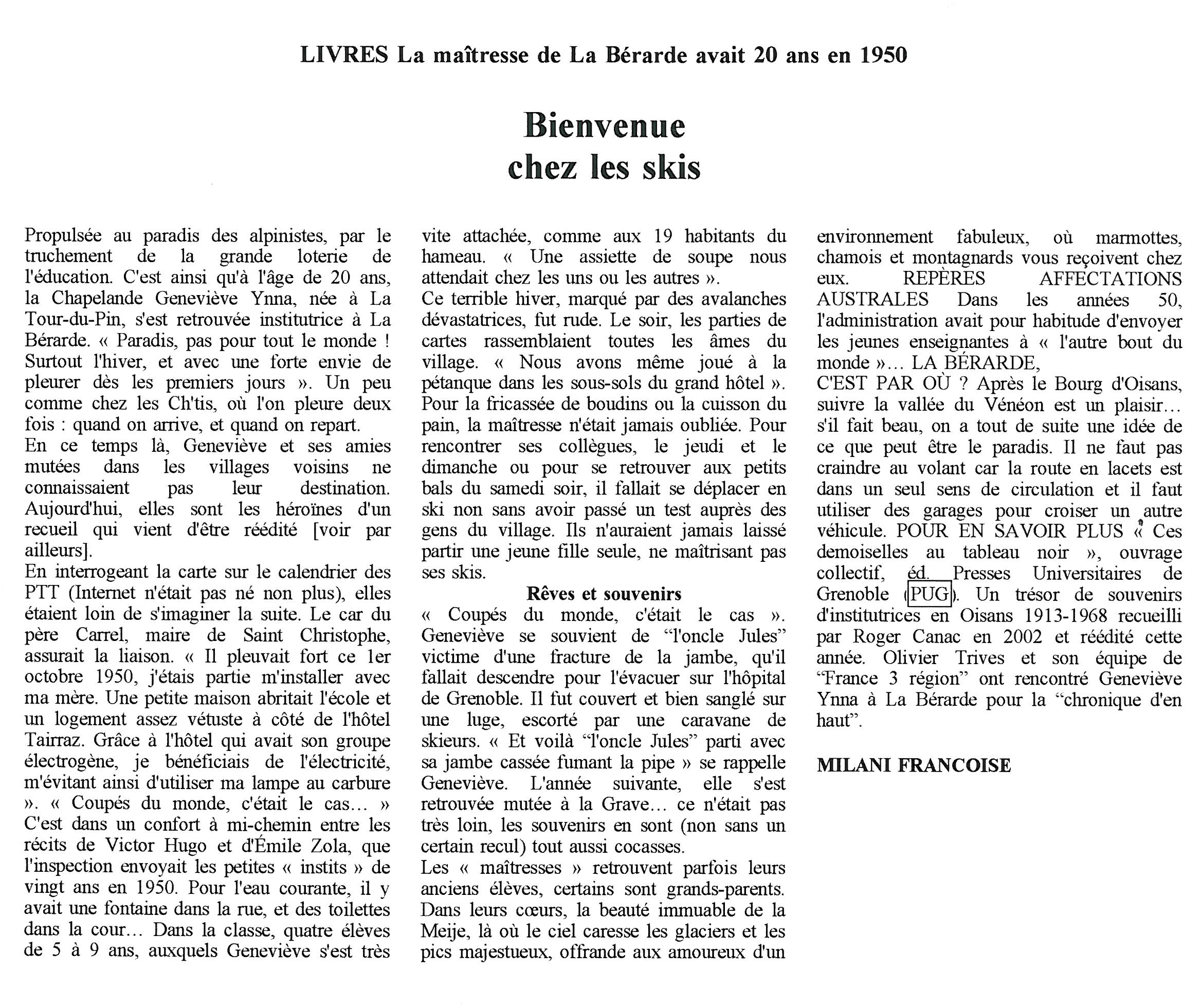 Le titre de ce livre en cache un autre, qui pourrait être « Maîtresses d’école du bout du monde ». Un bout du monde, en effet le massif de l’Oisans, au sud-est de Grenoble, avec ses sommets à près de 4 000 mètres, ses vallées et ses rivières tumultueuses aux noms chantants, la Romanche, le Vénéon, le Ferrand, la Lignarre, la Sarenne ou l’Eau d’Olle. Avant comme après la Seconde Guerre mondiale, les routes sont rares et les chemins acrobatiques, qui conduisent à des villages ou des hameaux perdus, coupés du monde par la neige, les avalanches, les coulées de boue. La « demoiselle » qui vient de terminer ses trois ans à l’École normale de Grenoble se trouve projetée dans un autre monde : celui de la haute montagne à la fois rude et exaltant. Mais l’évocation de cet univers à la Zola est aussi un hymne à la joie : une leçon simple, sans grandiloquence, de celles qu’on appelait justement « maîtresses »