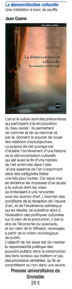 Cet essai met en évidence les impasses d’un accès à la culture dont les voies se limiteraient à une rencontre avec les œuvres d’art. L’examen des conditions de la réception de l’œuvre d’art, et de l’expérience esthétique qui en résulte, se substitue alors à l’évaluation des politiques culturelles sur le plan de la production, c’est-à-dire de l’économie du spectacle, et sur celui de la diffusion, envisagée à partir de la notion sociologique de public.
