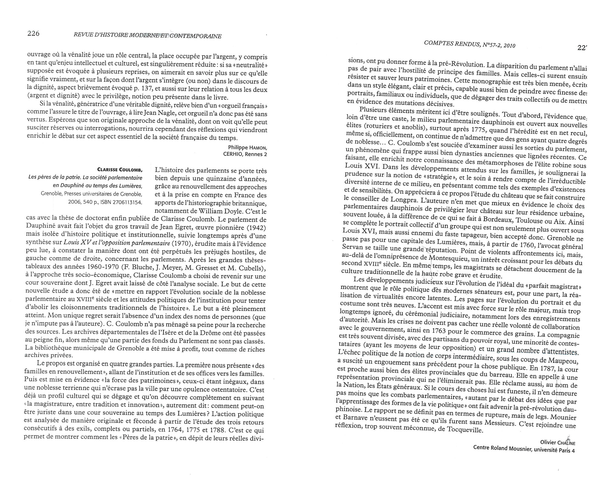 Ancienne élève de l’Ecole normale supérieure (Fontenay-Saint-Cloud), agrégée d’Histoire, Clarisse Coulomb est maître de conférences à l’université Pierre Mendès France de Grenoble II. Elle est membre du LARHRA (Laboratoie de recherche historique Rhône-Alpes).