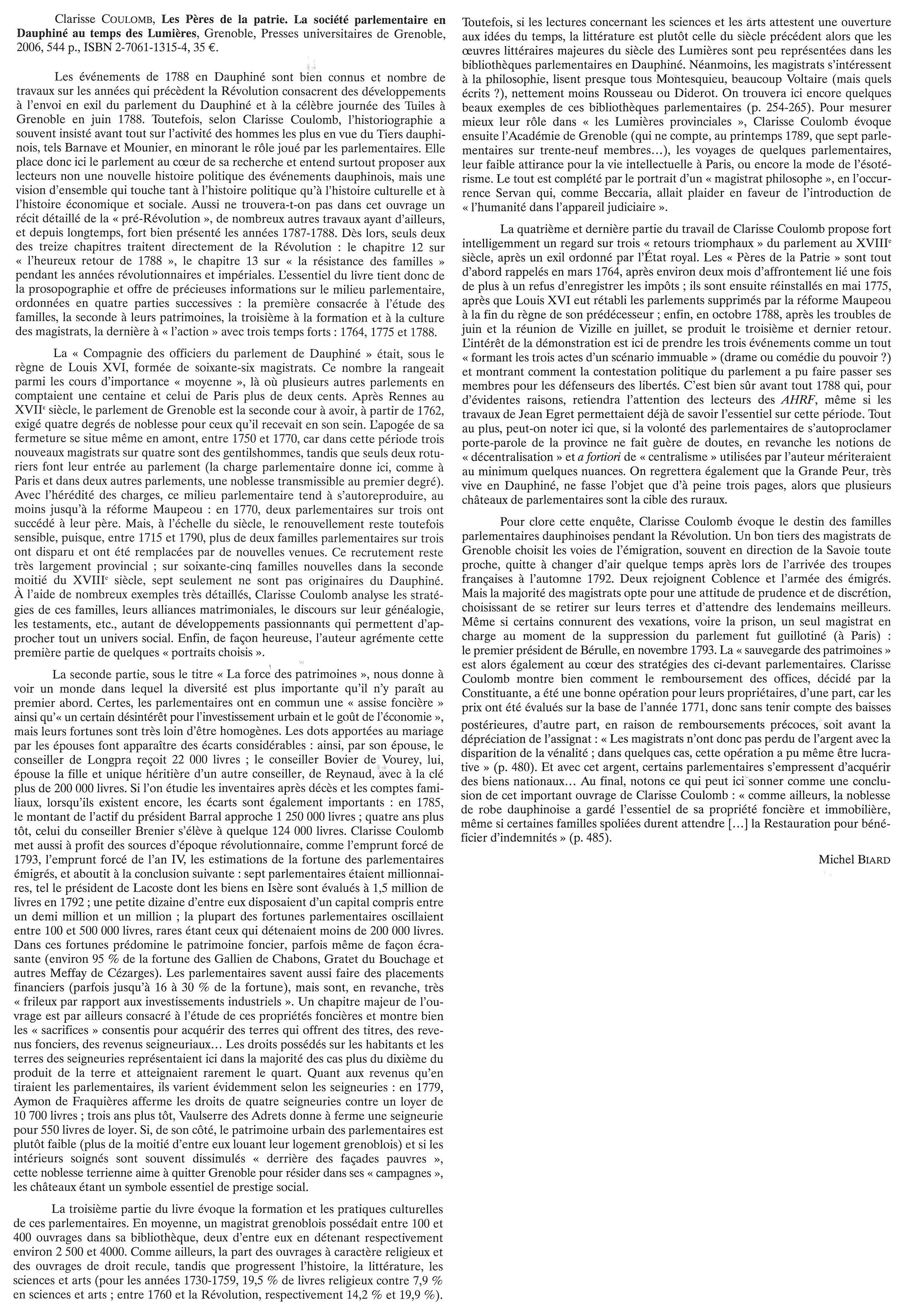 Comment l’envoi du parlement de Dauphiné en exil, le 7 juin 1788, a-t-il pu provoquer l’émeute sanglante de la population grenobloise ? Et surtout, pourquoi cette célèbre journée des Tuiles a-t-elle été suivie de l’union des trois ordres de la province, réclamant la convocation des États généraux et le rappel des États provinciaux, avec le doublement du tiers, ce qui est un programme unique en France ? Ce livre propose une relecture des origines de la Révolution à travers le rôle joué par le parlement de Dauphiné trop souvent minoré au profit des hommes du tiers comme Mounier ou Barnave. Loin d’une seule histoire politique, à la manière de Jean Egret, l’auteur articule l’analyse socio-économique à l’analyse culturelle et politique. La société parlementaire dauphinoise ainsi révélée apparaît moins comme une caste en déclin, crispée sur ses privilèges, que comme une société largement ouverte tant aux élites nouvelles qu’aux idées des Lumières.