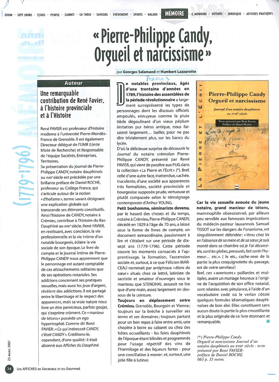 Préface de Daniel Roche Le 29 janvier 1780, le jeune Pierre-Philippe Candy quittait Crémieu pour aller à Grenoble suivre une formation en pratique pour devenir notaire. Ce départ, qui faisait suite à la mort de son frère aîné, marqua une rupture dans la vie du jeune homme destiné au préalable au séminaire. Désormais seul héritier mâle de la famille, il entreprit de tenir régulièrement son livre de compte, qui très vite devint aussi le livre de son intimité et le récit de sa vie sociale. C’est ce récit, à la fois concret et intimiste, qui est présenté dans cet ouvrage. Candy y dévoile successivement les différentes étapes de sa formation et de son établissement comme notaire, son goût prononcé pour le jeu et la fête (à Grenoble comme dans le bas Dauphiné), la crudité de ses expériences sexuelles (dans une écriture parfois codée), sa curiosité envers les auteurs contemporains (de la littérature pornographique à l’Encyclopédie, en passant par le traité du docteur Tissot), son orgueil et son mépris des femmes, son engagement révolutionnaire dans le camp des modérés, en même temps que son arrivisme qui fit de lui le principal notaire de sa ville et son premier magistrat.