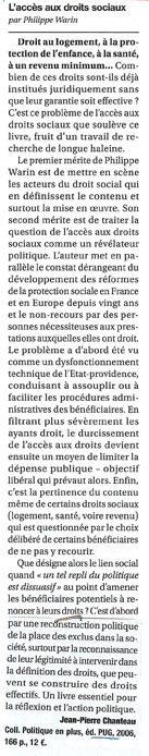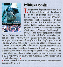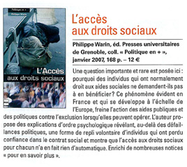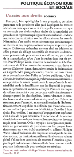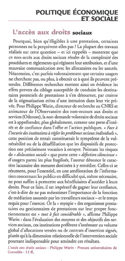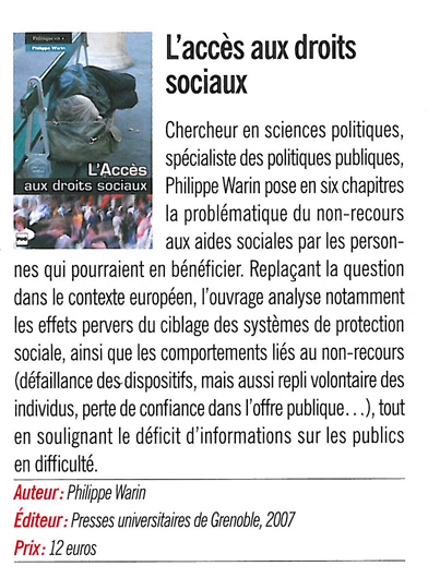 Cet ouvrage pose une question importante qui est très souvent occultée : pourquoi des individus, qui ont normalement droit à des aides sociales, ne demandent-ils pas à en bénéficier ? Les systèmes de protection sociale, en permanente évolution, et les politiques de lutte contre l’exclusion, butent notamment sur cette difficulté : ceux qui auraient le plus besoin des aides publiques pour les aider à se réinsérer ne recourent pas toujours aux prestations qui leur sont destinées. Le phénomène a été mis en évidence pour la France, mais aussi à l’échelle européenne. L’ouvrage présente les meilleures études sur l’extension d’un problème encore très mal connu. Il essaie aussi de fournir des explications, qui relèvent à la fois de la psychologie sociale et de l’étude des politiques publiques en action. On peut incriminer des défaillances dans les dispositifs d’action sociale mais il existe aussi des formes de repli volontaire des individus, qui manifestent une perte de confiance dans l’offre publique. L’accès égalitaire de tous aux droits sociaux n’a en fait rien d’automatique. Cet ouvrage traite ce sujet capital pour la cohésion sociale de façon très didactique.