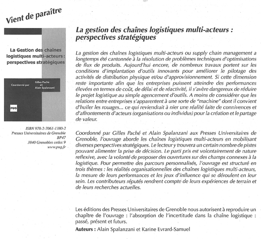 Alain Spalanzani est professeur en sciences de gestion à l’université Pierre Mendès France (UPMF) de Grenoble où il assume les fonctions de premier vice-président. Il dirige, par ailleurs, la spécialité professionnelle « Management et Systèmes d’Information de la chaîne logistique » du master « Systèmes d’information et d’organisation » et co-dirige la spécialité recherche. Chercheur au Centre d’études et de recherches appliquées à la gestion (CERAG UMR CNRS 5820), il est auteur et co-auteur de plusieurs ouvrages et articles portant sur la gestion des stocks, la gestion industrielle et la production et le management de la qualité. Ses travaux actuels de recherche portent sur le management des connaissances, les systèmes d’information et la collaboration inter organisationnelle dans les entreprises en réseaux.