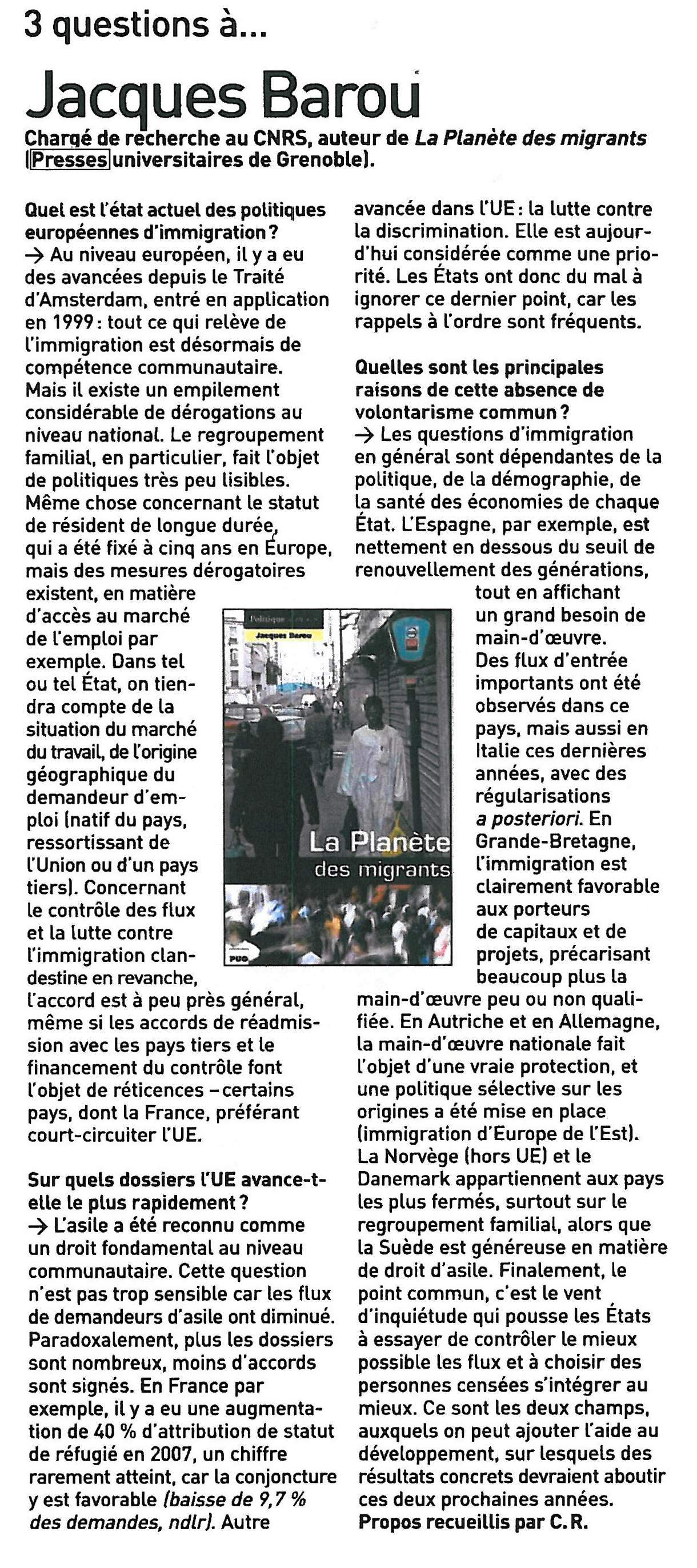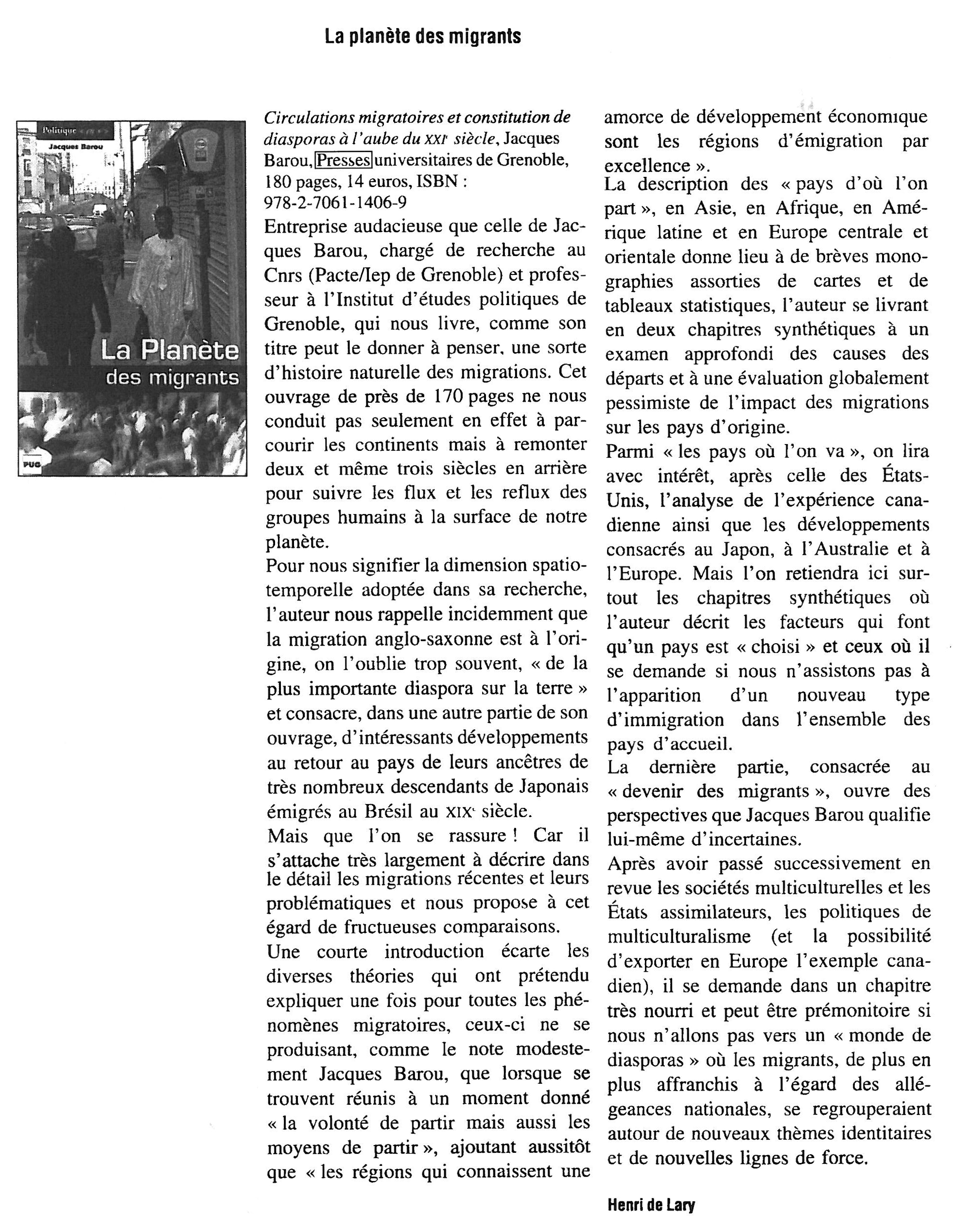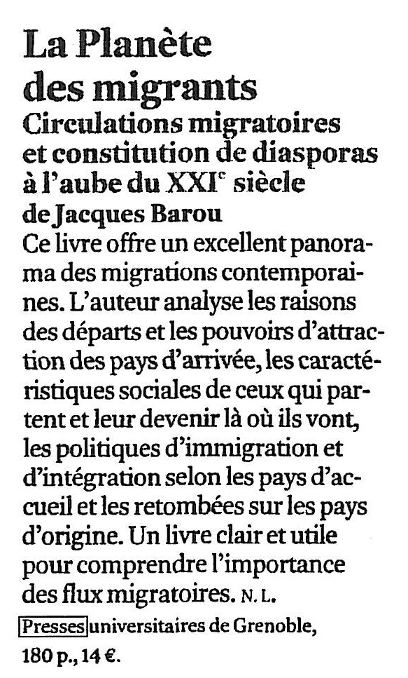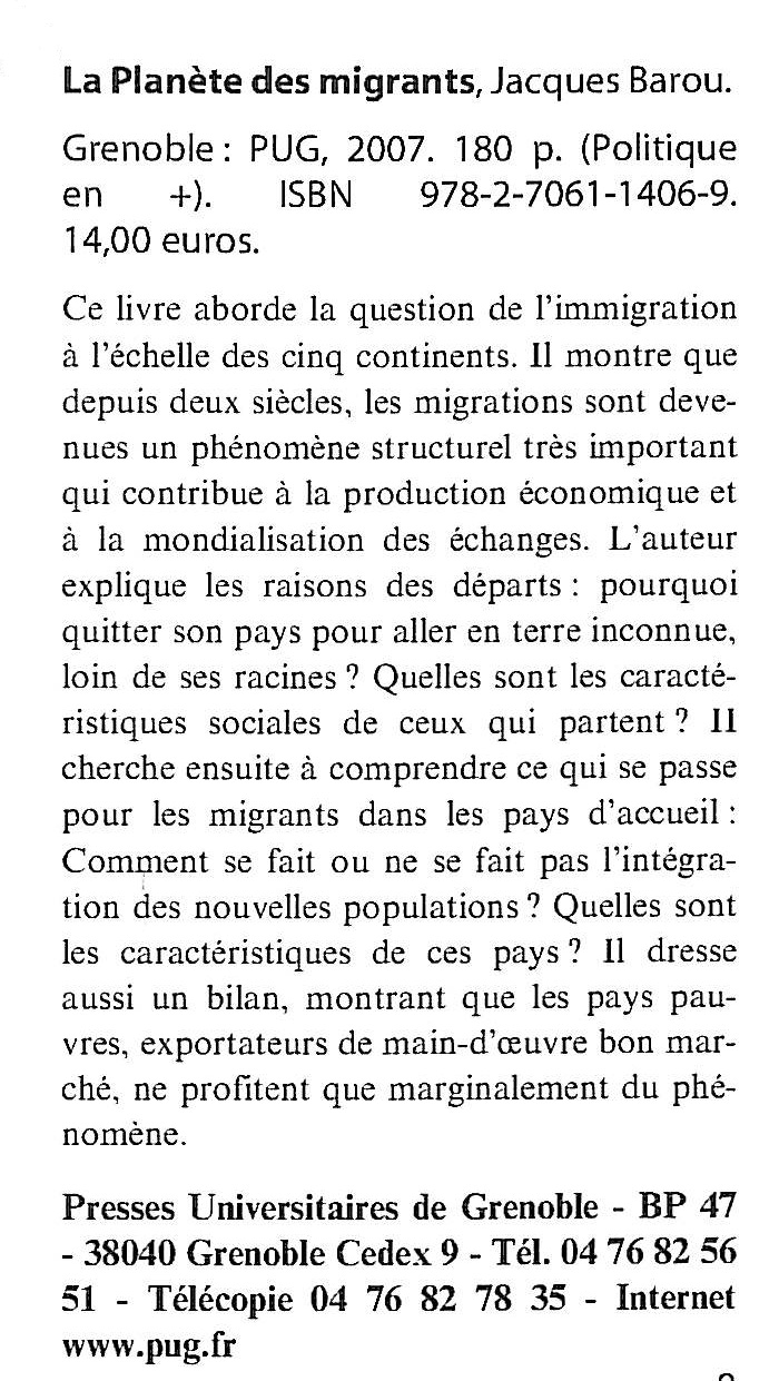 On réduit trop souvent la question de l’immigration à ce qui en est dit en France dans le débat politique. Ce livre aborde le sujet de façon beaucoup plus large, à l’échelle des cinq continents. Il montre que depuis deux siècles, les migrations sont devenues un phénomène structurel très important qui contribue à la production économique et à la mondialisation des échanges. Elles influencent aussi les relations internationales entre États. On peut s’attendre à un accroissement des flux migratoires, donnant naissance à des diasporas gardant des relations régulières avec les pays d’origine. L’ouvrage présente un panorama précis des flux migratoires. Il explique les raisons des départs : pourquoi quitter son pays pour aller en terre inconnue, loin de ses racines ? Quelles sont les caractéristiques sociales de ceux qui partent ? Il cherche ensuite à comprendre ce qui se passe pour les migrants dans les pays d’accueil : Comment se fait – ou ne se fait pas – l’intégration des nouvelles populations ? Quelles sont les caractéristiques de ces pays ? Jacques Barou dresse aussi un bilan, montrant que les pays pauvres, exportateurs de main-d’œuvre bon marché, ne profitent que marginalement du phénomène : c’est rarement pour eux un facteur de développement. Les migrations semblent donc contribuer à l’accroissement des écarts entre pays riches, qui peuvent en faire un atout, et pays pauvres qui n’en tirent que de maigres profits.