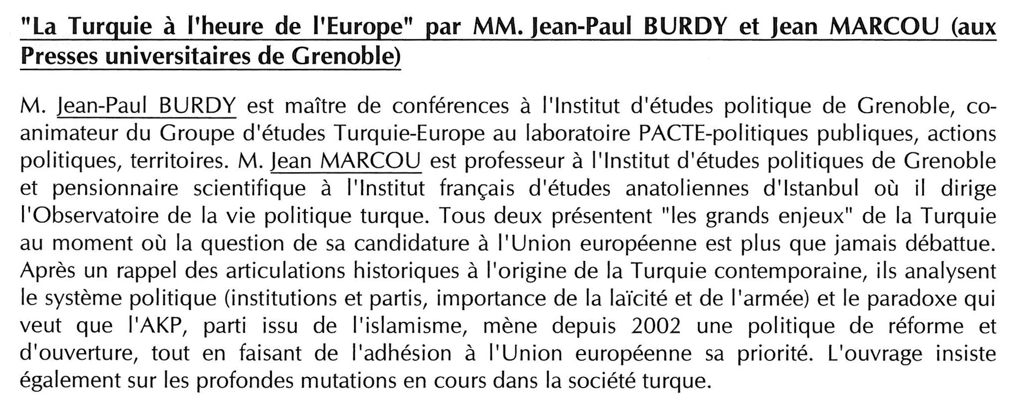 Jean-Paul Burdy est maître de conférences d’histoire à l’Institut d’études politiques de Grenoble, co-animateur du Groupe d’études Turquie-Europe (GRETE) au laboratoire PACTE (Politiques publiques, Actions politiques, Territoires) de Grenoble.