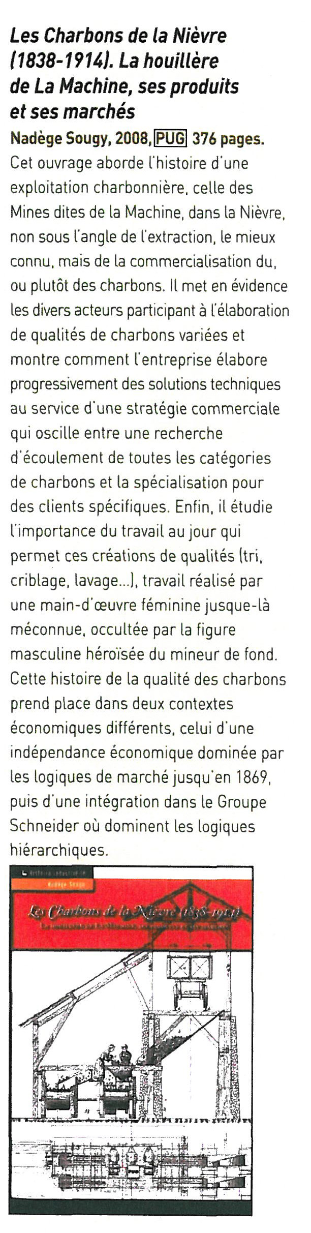 C et ouvrage aborde l’histoire d’une exploitation charbonnière, celle des Mines dites de La Machine, dans la Nièvre, non sous l’angle de l’extraction, le mieux connu, mais de la commercialisation du ou plutôt des charbons. Il met en évidence les divers acteurs participant à l’élaboration de qualités de charbons variées et montre comment l’entreprise élabore progressivement des solutions techniques au service d’une stratégie commerciale qui oscille entre une recherche d’écoulement de toutes les catégories de charbons et la spécialisation pour des clients spécifiques. Enfin, il étudie l’importance du travail au jour qui permet ces créations de qualités (tri, criblage, lavage…), travail réalisé par une main-d’œuvre féminine jusque-là méconnue, occultée par la figure masculine héroïsée du mineur de fond.