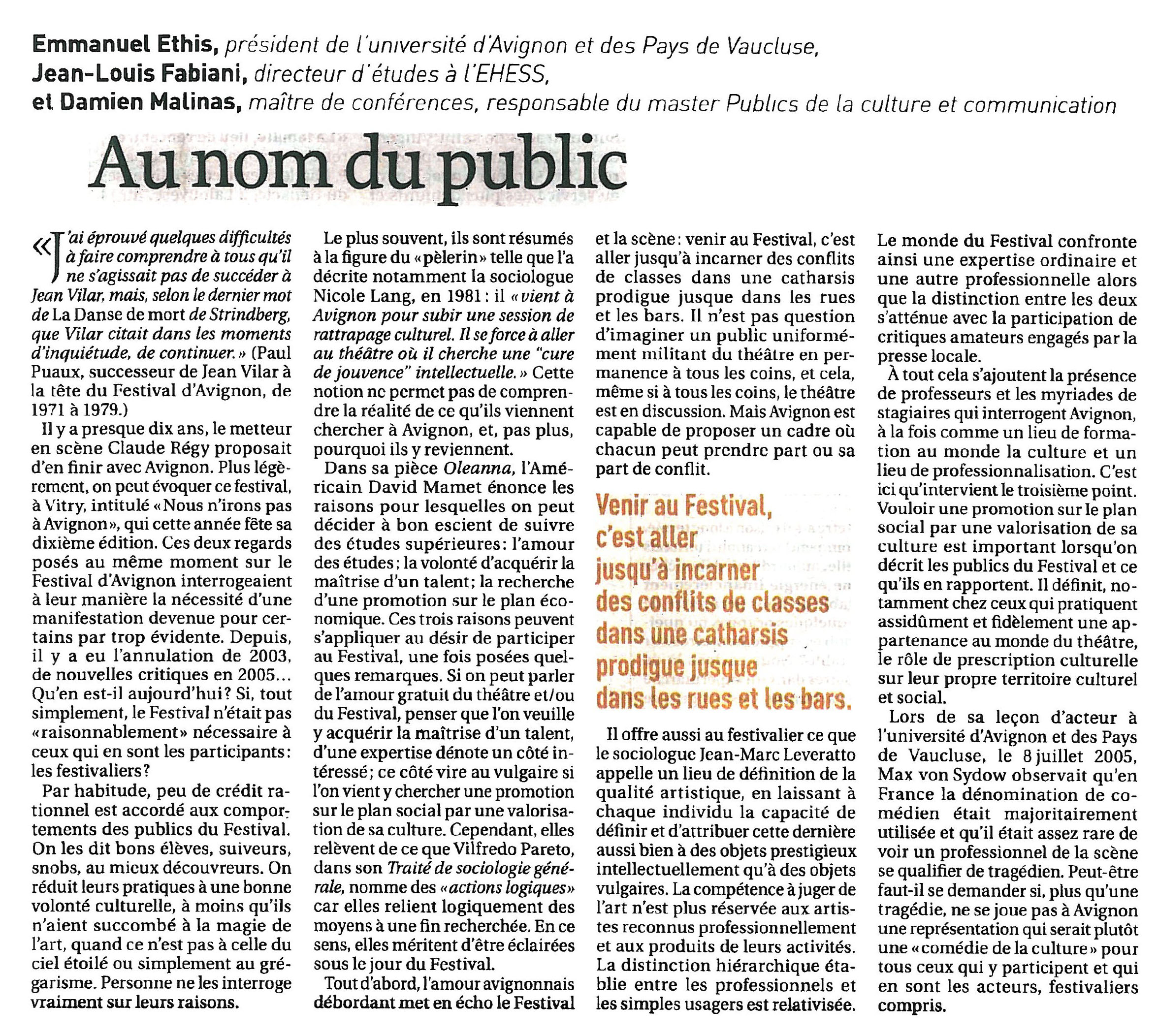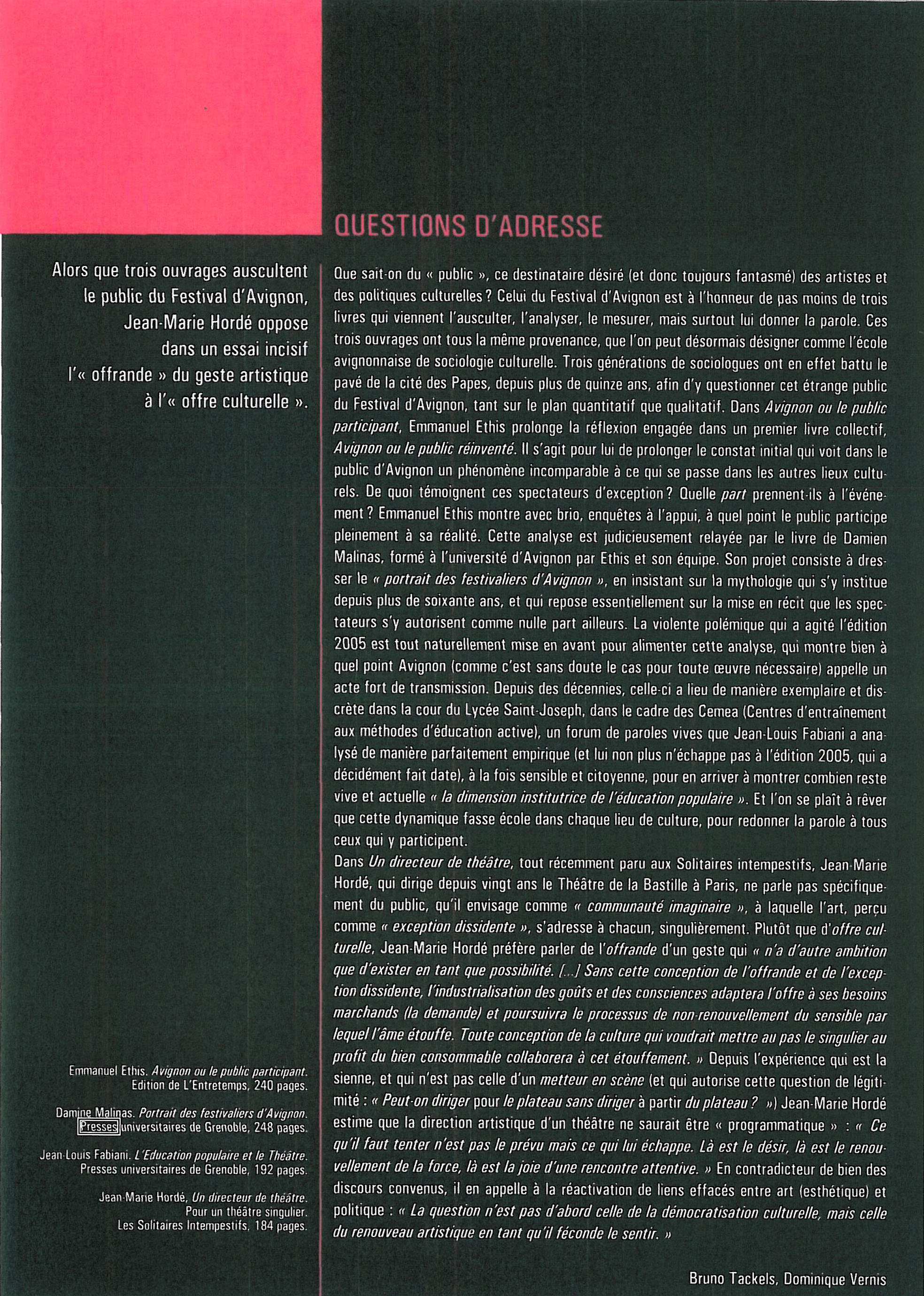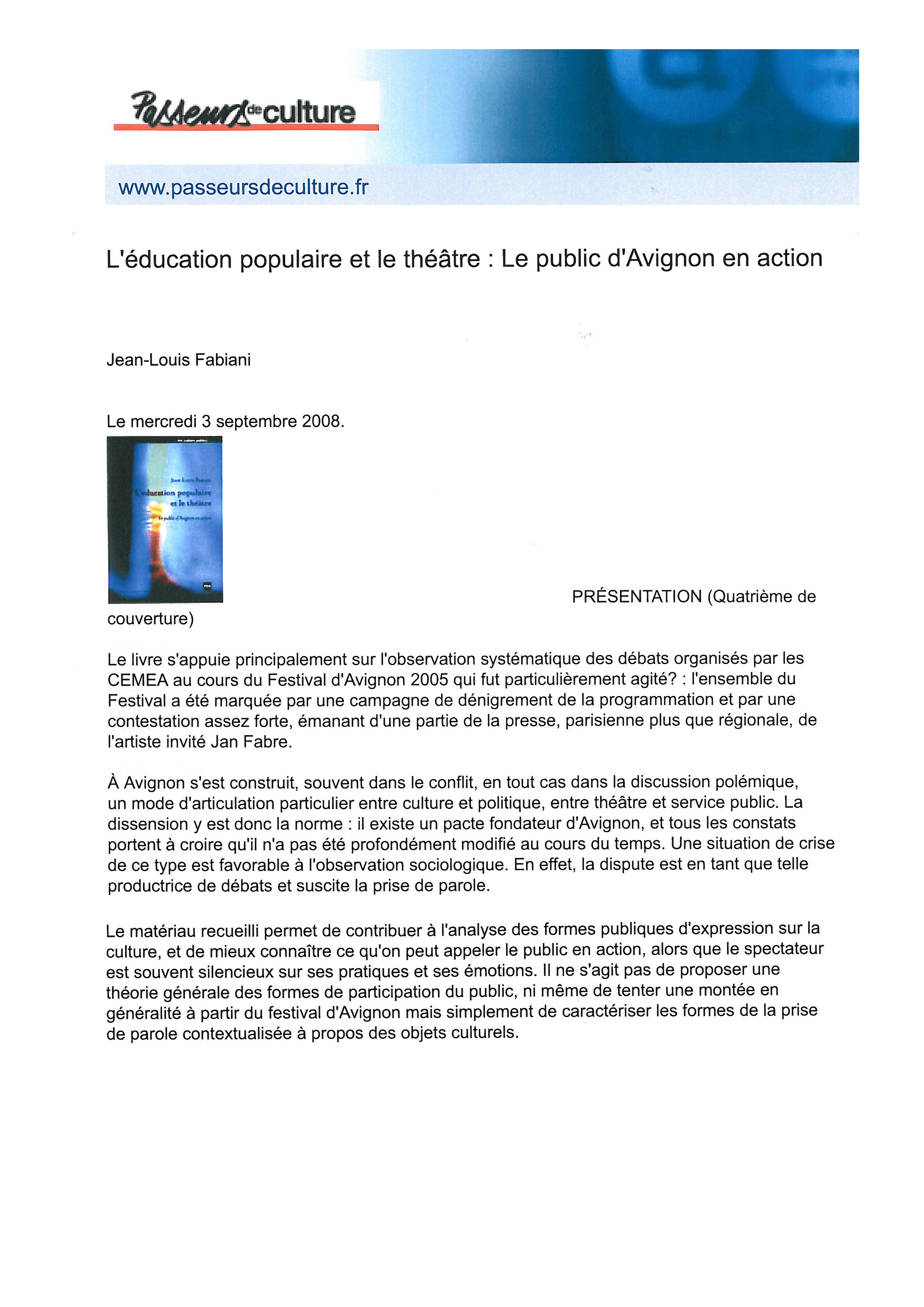 Le livre s’appuie principalement sur l’observation systématique des débats organisés au cours du Festival d’Avignon 2005. L’édition 2005 a été particulièrement agitée : elle a été marquée par une campagne de dénigrement de la programmation et par une contestation assez forte, émanant d’une partie de la presse, de l’artiste invité Jan Fabre. À Avignon s’est construit, depuis 1947, un mode d’articulation particulier entre culture et politique, entre théâtre et service public. Il existe un pacte fondateur du Festival, et tous les constats portent à croire qu’il n’a pas été profondément modifié au cours du temps.