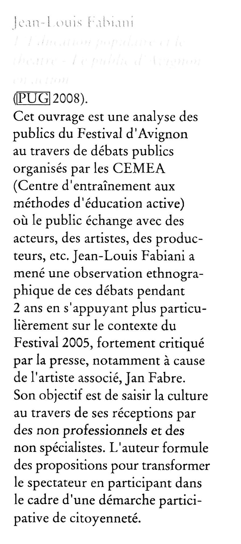 Le matériau recueilli permet de contribuer à l’analyse des formes publiques d’expression sur la culture, et de mieux connaître ce qu’on peut appeler le public en action, alors que le spectateur est souvent silencieux sur ses pratiques et ses émotions. Il ne s’agit pas de proposer quelque chose comme une théorie générale des formes de participation du public, ni même de tenter une montée en généralité à partir du festival d’Avignon. Simplement, en s’appuyant sur ce qu’il y a de plus solide dans l’analyse monographique, on s’efforce de caractériser les formes de la prise de parole contextualisée à propos des objets culturels.