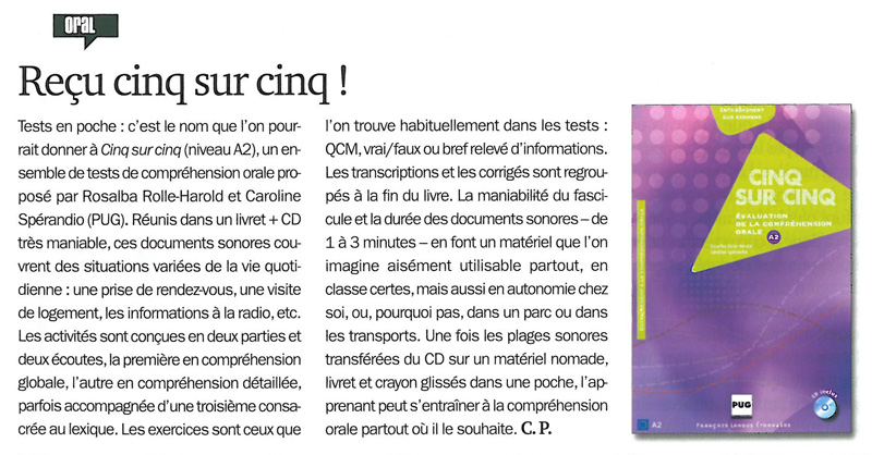- d’un CD audio comprenant 29 documents sonores (dialogues ou monologues) qui illustrent des situations tirées de la vie quotidienne des Français. Les savoir-faire sélectionnés correspondent aux prescriptions du Cadre européen commun de référence (CECR) pour le niveau A2 concernant la compréhension orale : se présenter, exprimer une opinion, demander des informations, accueillir, donner des conseils, mais aussi comprendre des annonces, des informations, etc. ;