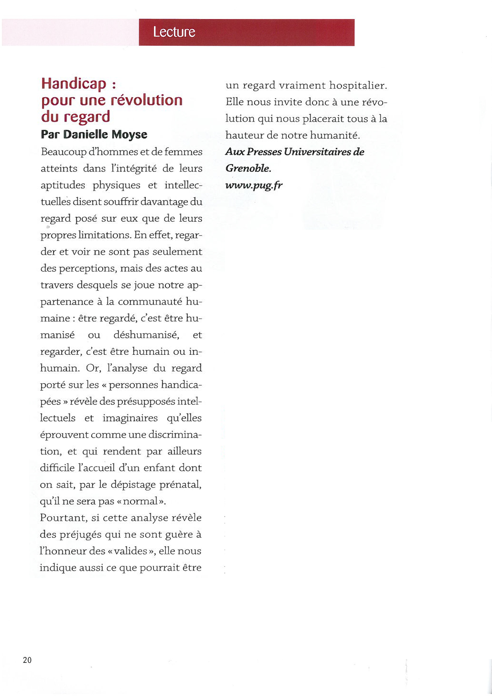 Pourtant si cette analyse révèle des préjugés qui ne sont guère à l’honneur des « valides », elle nous indique aussi ce que pourrait être un regard vraiment hospitalier. Elle nous invite donc à une révolution qui nous placerait tous à la hauteur de notre humanité.