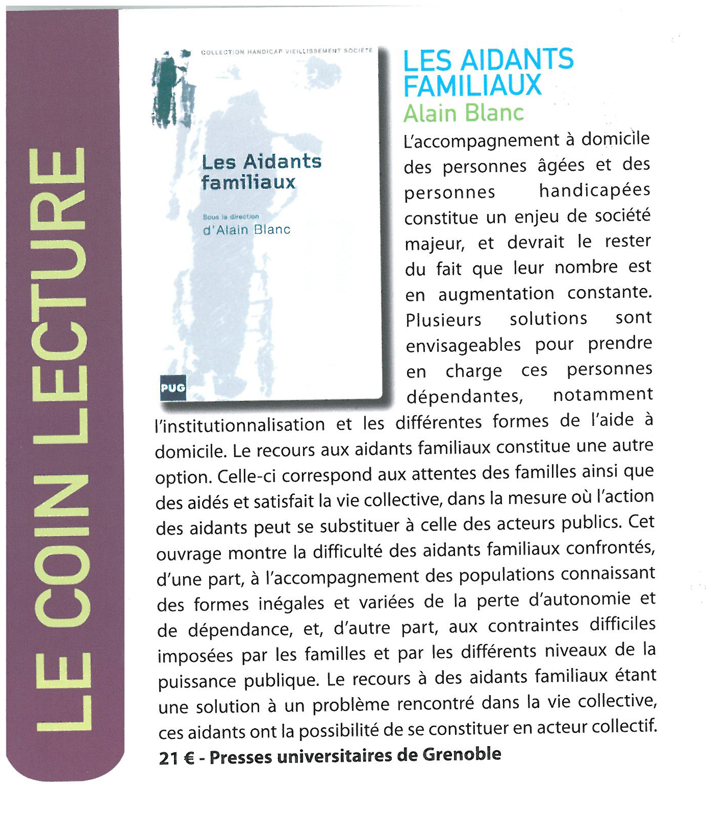 En ce début de troisième millénaire, l’accompagnement à domicile des personnes âgées et des personnes handicapées constitue un enjeu de société réactualisé. Le nombre de ces personnes et les possibilités de leur accompagnement, collectivement valorisées, sont en effet en augmentation. Plusieurs solutions sont possibles pour prendre en charge ces personnes dépendantes, dont l’institutionnalisation et les différentes formes de l’aide à domicile. Le recours aux aidants familiaux constitue une autre option qui correspond aux attentes des familles et des aidés et satisfait la vie collective, dans la mesure où l’action des aidants peut se substituer à celles des acteurs publics. Cet ouvrage montre la difficulté des aidants familiaux confrontés, d’une part, à l’accompagnement des populations connaissant des formes inégales et variées de la perte d’autonomie et de la dépendance et d’autre part, aux contraintes difficiles imposées par les familles et par les différents niveaux de la puissance publique. Le recours à des aidants familiaux étant une solution à un problème rencontré dans la vie collective, ces aidants ont la possibilité de se constituer en acteur collectif. Afin d’élargir la réflexion, deux situations, en Suisse et en Belgique, complètent l’ouvrage.